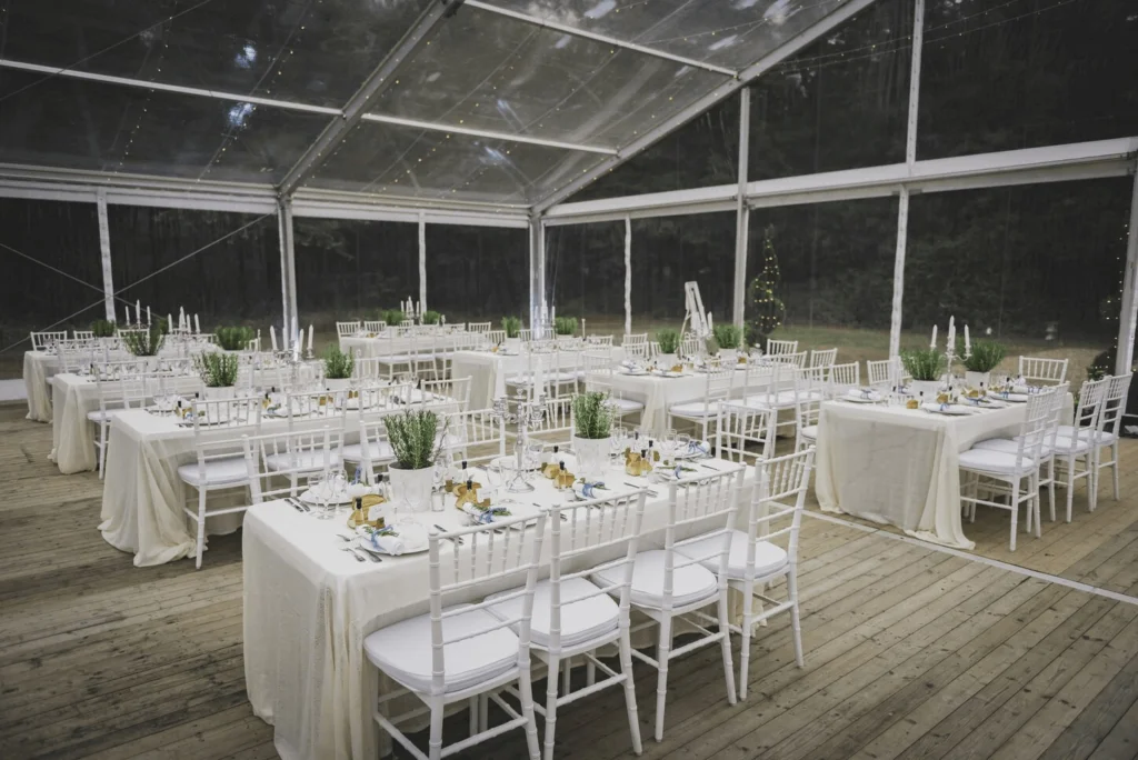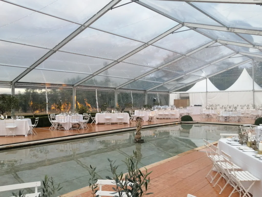 La Tente Cristal est modulable et offre une multitude de possibilités par exemple : toit opaque et rideaux cristal, toit et rideaux cristal, toit cristal et rideaux moitié cristal et moitié opaque, etc.